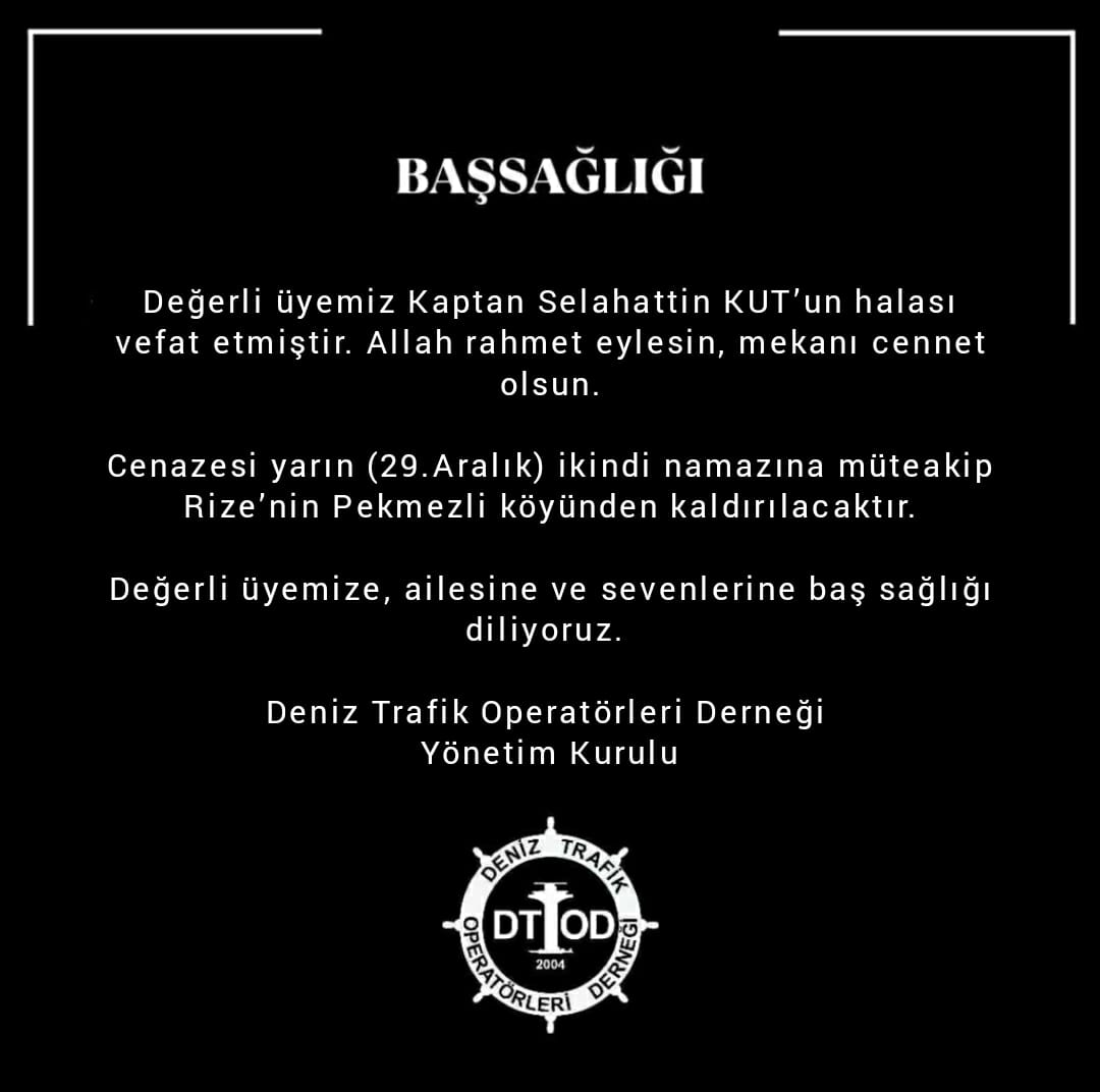 Değerli üyemiz Kaptan Selahattin KUT’un halası vefat etmiştir. Allah rahmet eylesin, mekanı cennet olsun. Değerli üyemize, […]