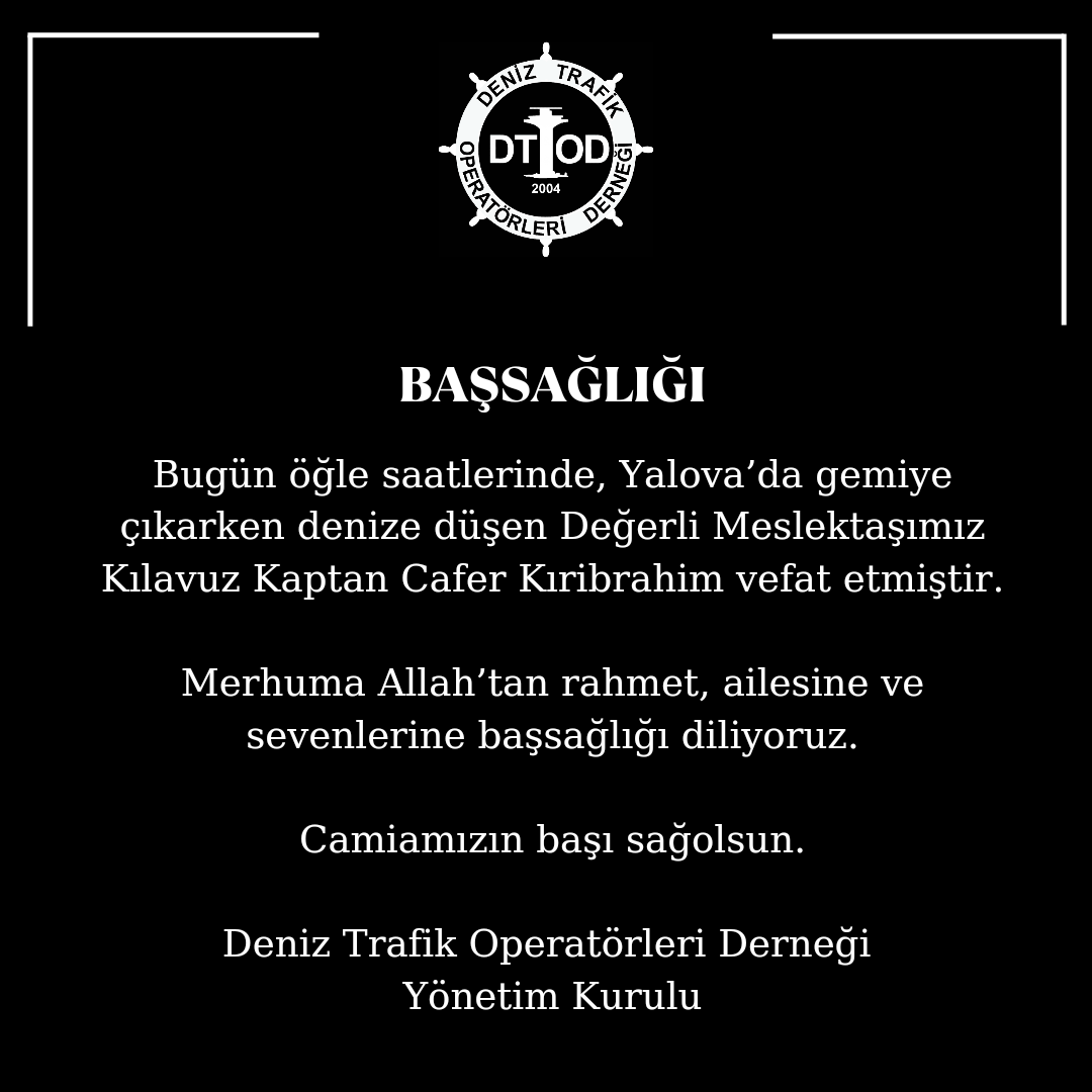Bugün öğle saatlerinde, Yalova’da gemiye çıkarken denize düşen Değerli Meslektaşımız Kılavuz Kaptan Cafer Kıribrahim vefat etmiştir.Merhuma […]