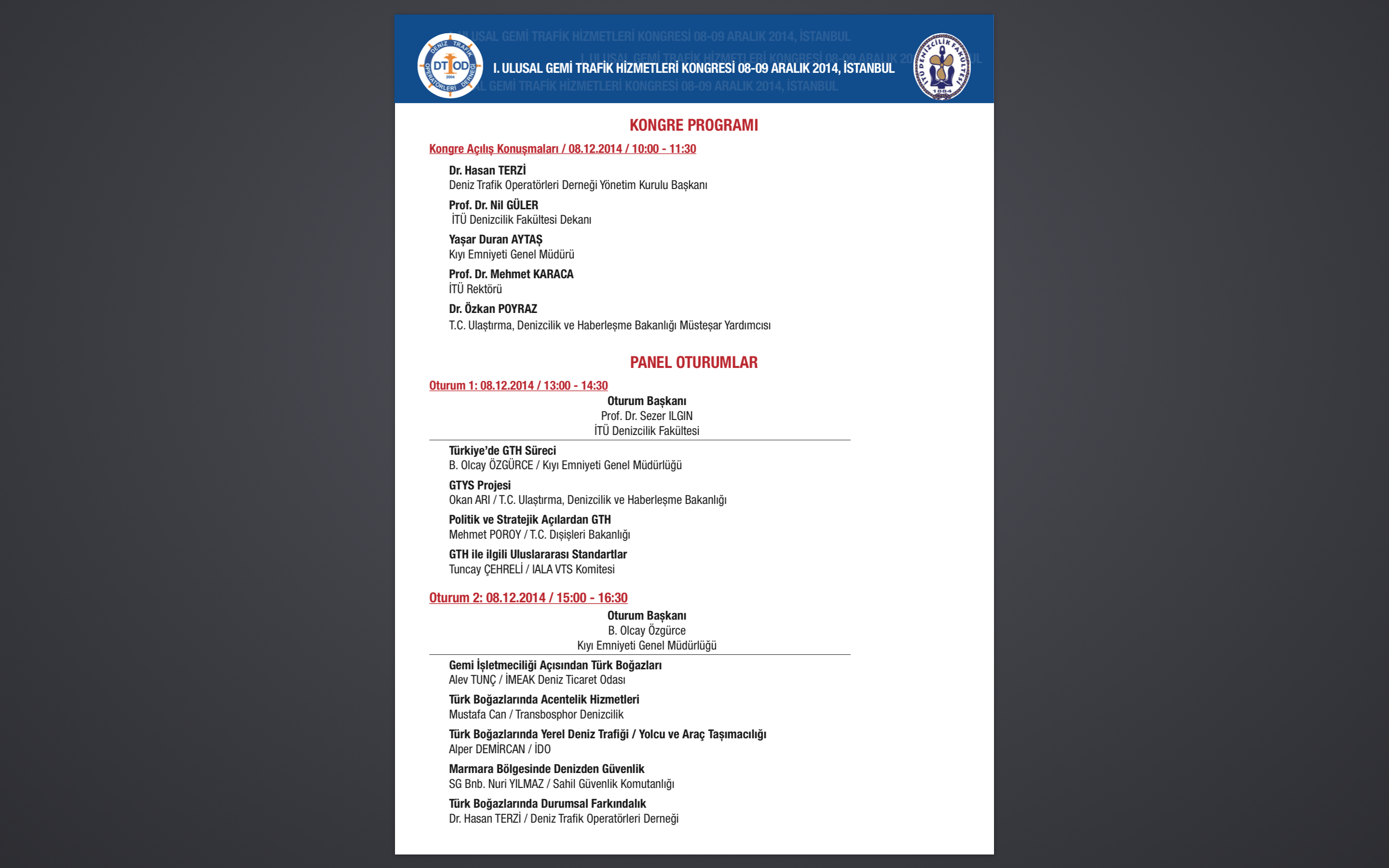 Bu kapsamda Derneğimiz ve İTÜ Denizcilik Fakültesinin organize ettiği ve Türkiye’nin GTH konusunda dünyada son derece saygın bir konuma gelmesine katkı sağlayacak olan I. Ulusal Gemi Trafik Hizmetleri Kongresi 8-9 Aralık 2014 tarihlerinde İTÜ Süleyman Demirel Kongre Merkezinde düzenlenecektir.