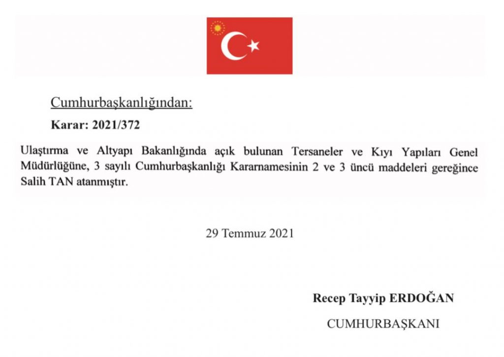 Cumhurbaşkanlığı 2021/372 Kararnamesi ile Tersaneler ve Kıyı Yapıları Genel Müdürlüğü görevine atanan Sn. Salih Tan’ı tebrik eder, yeni görevinde başarılar dileriz.